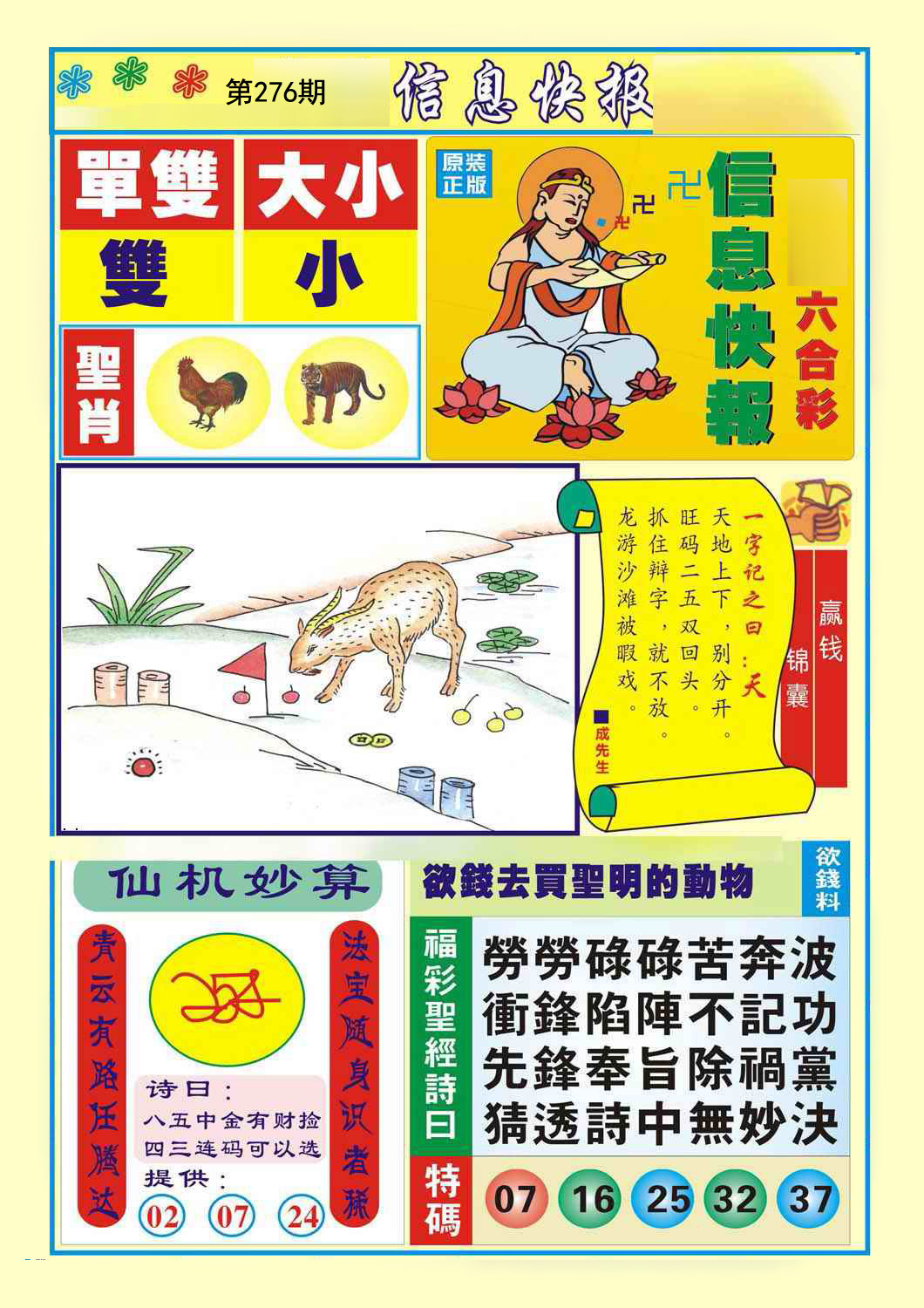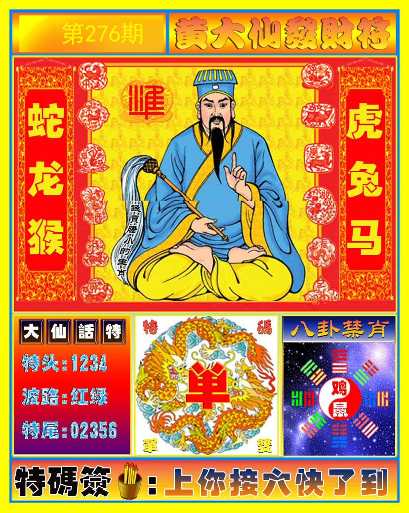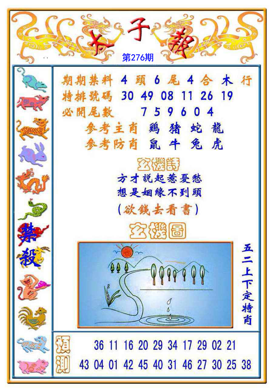 276期:必中七肖: 兔鸡蛇虎狗鼠龙 |