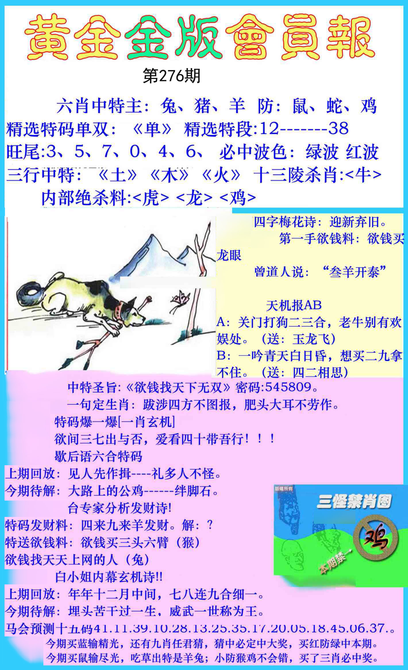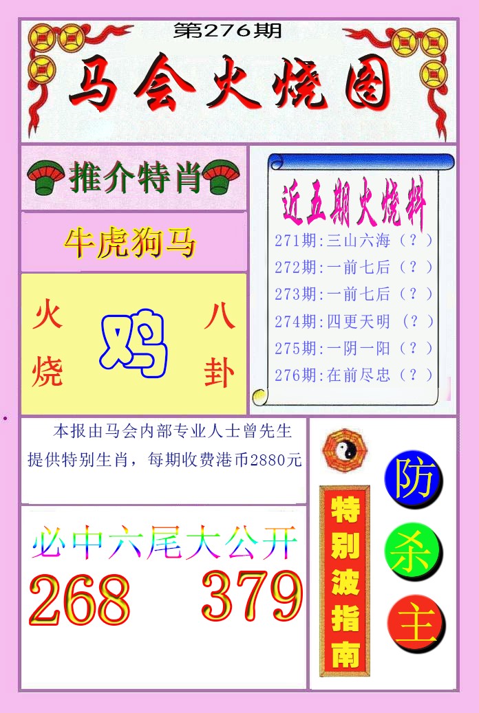 276期:必中五肖: 兔鸡蛇虎狗 |
