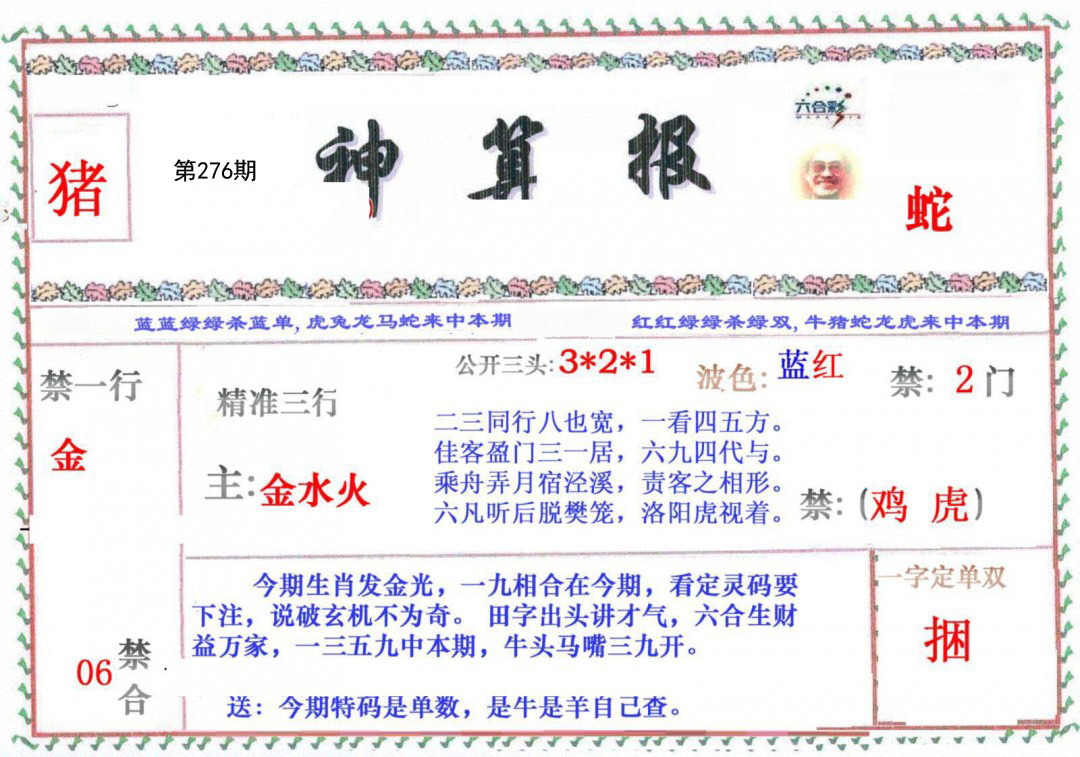 276期:必中㈢肖: 兔鸡蛇 |