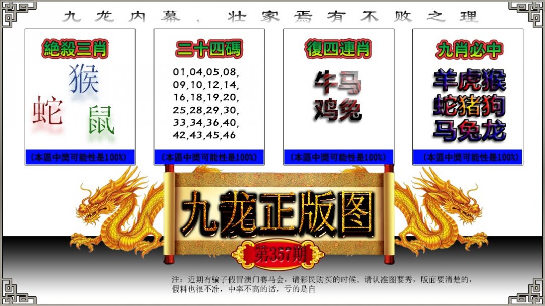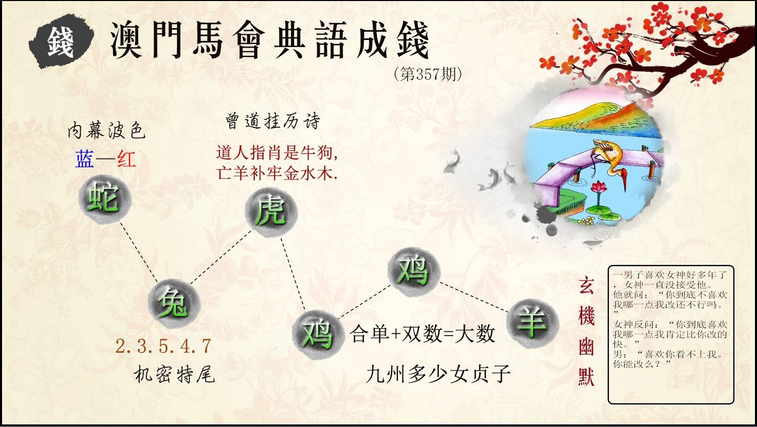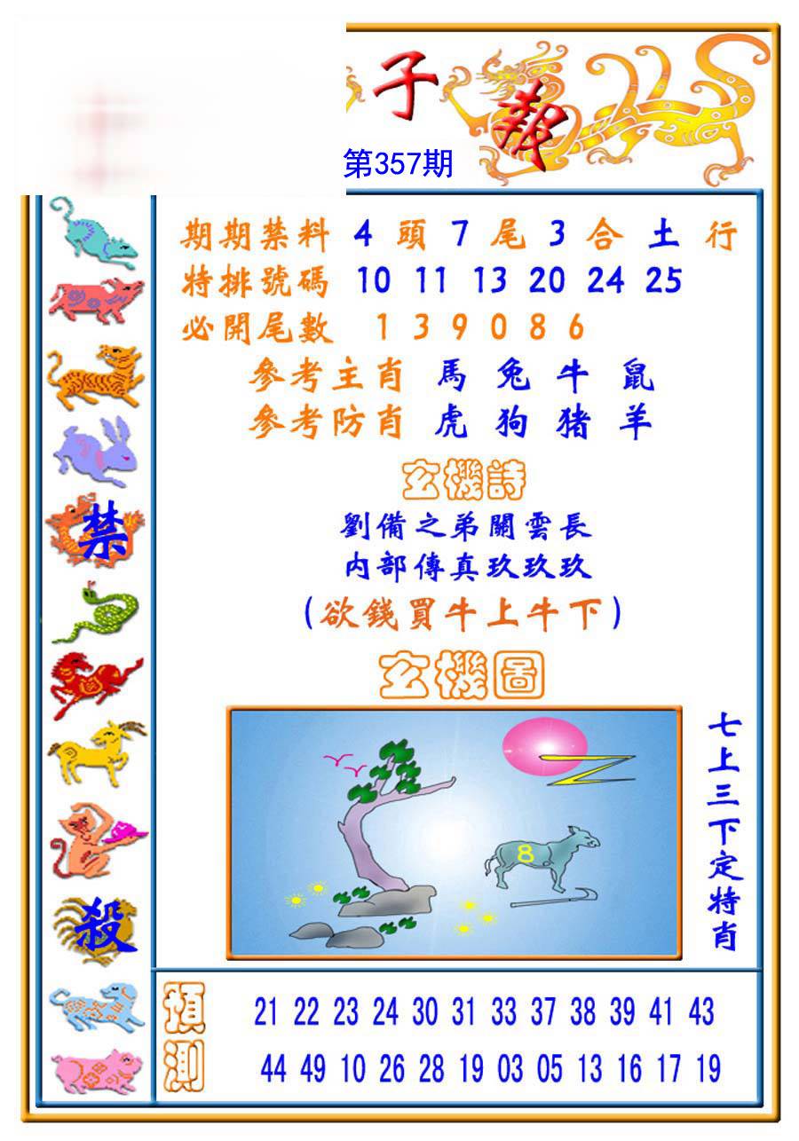 | 357期:必中七肖: 狗羊鼠龙猴鸡蛇 |